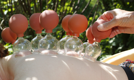 Diese uralte Reiztherapie zählt zu den so genannten ausleitenden Verfahren. Mit Hilfe glockenförmiger Glaskuppeln, Schröpfgläser genannt, erzeuge ich einen Unterdruck auf der Haut.